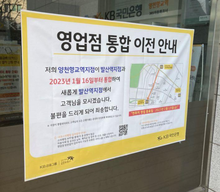 오랜만에 국민은행을 방문할 일이 있어서 국민은행 양천향교역지점을 갔습니다. 그런데 폐점 안내글이 있었습니다. 정확하게 말하자면 통합이전이라고 하지만 소비자들이 느끼기에는 그냥 폐점이라고 해야 맞을 것 같습니다. 여기 '국민은행 양천향교역지점'이 폐점이 되었으니, 만약 이젠 국민은행 창구에서 볼일이 생기신다면 '국민은행 발산역지점'으로 가셔야 일을 보실 수 있습니다.